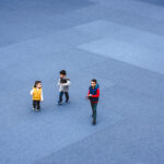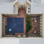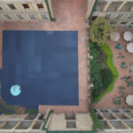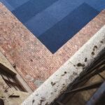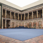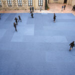 En el patio central se encuentra instalada una superficie de fieltro que se extiende sobre casi todo el suelo de ladrillo. De color casi gris o casi azul, el plano, de forma casi cuadrada y de textura casi alfombrada, se altera por el tránsito de las personas.